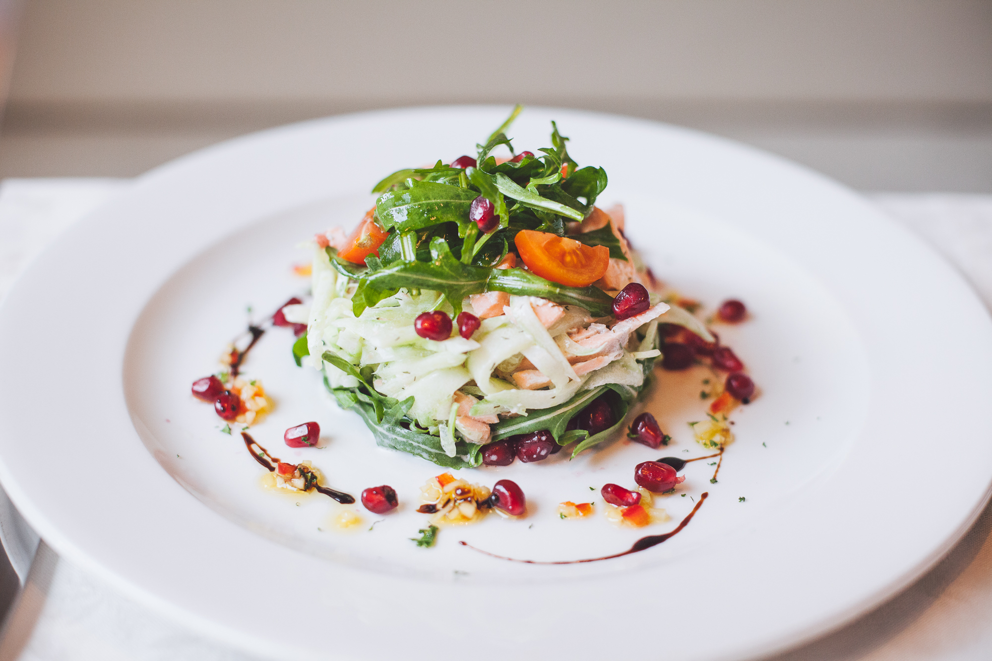 Poached salmon fillet, julienned cucumber, pomegranate, cream, olive oil, cherry tomatoes, arugula, red onion.