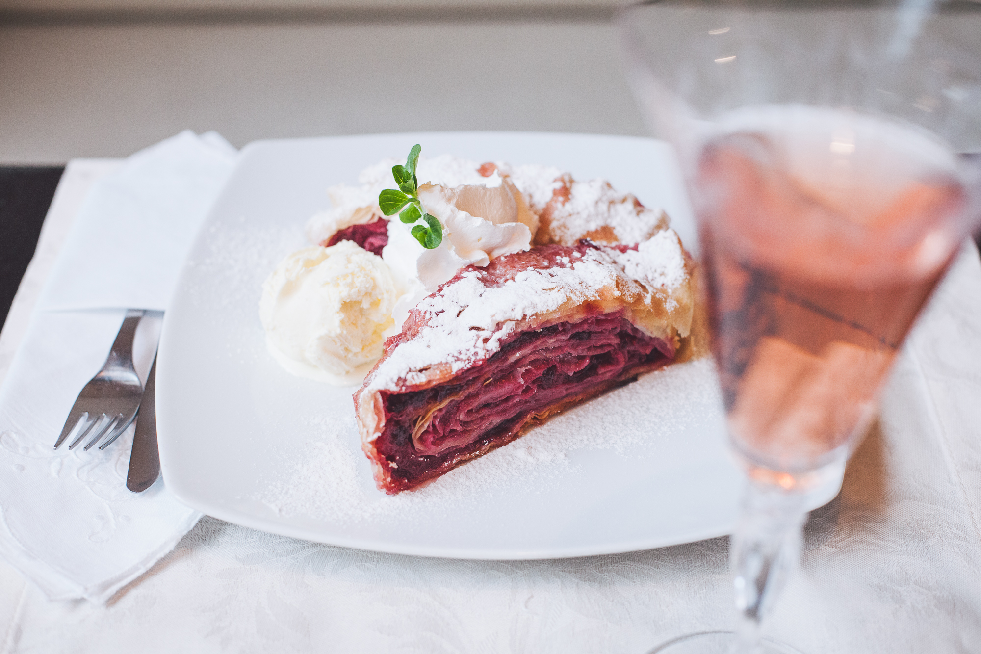 Apple, cinnamon, raisins, crème caramel, rum, almonds.