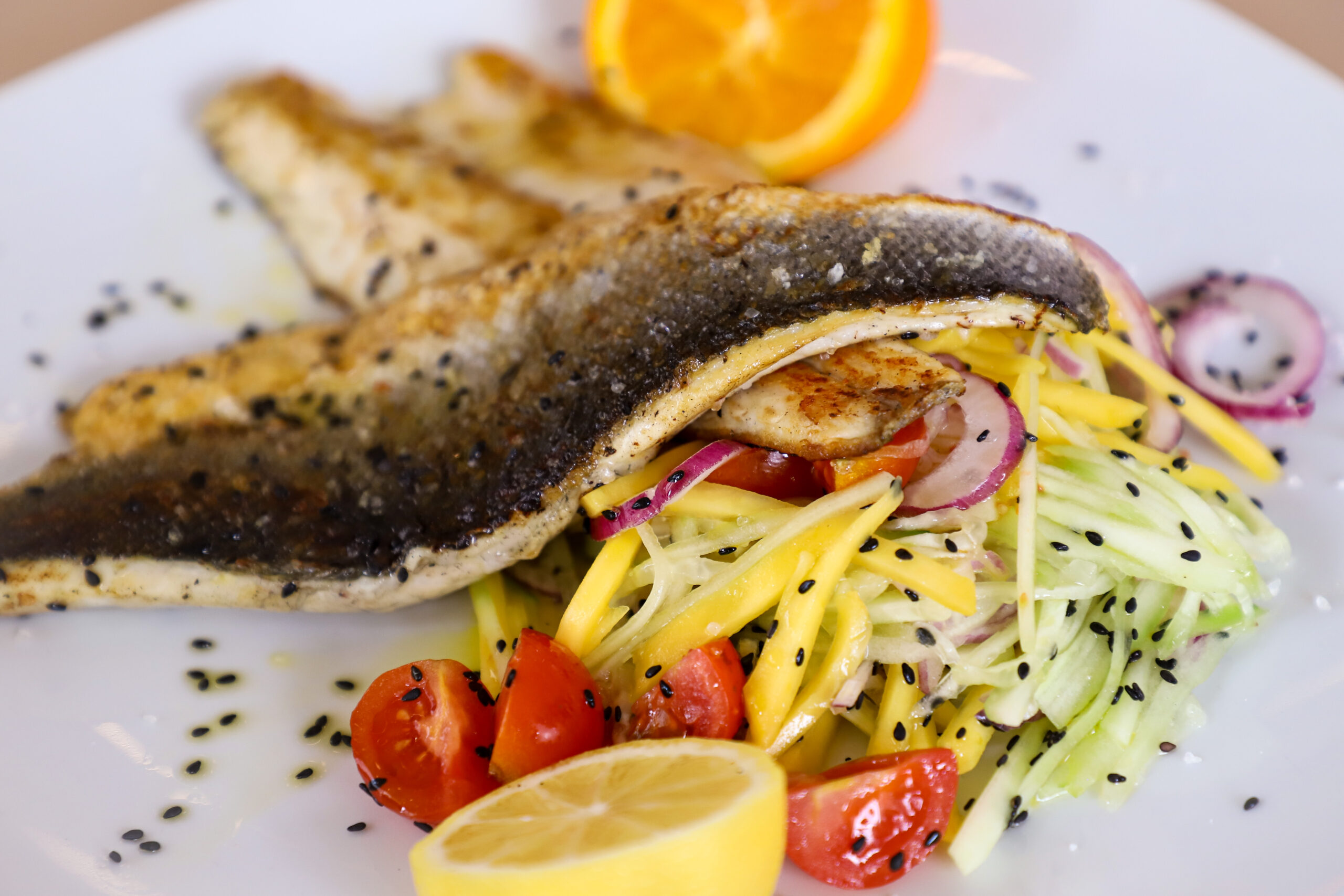 Brancin file, mango žilijen, crveni luk, krastavac, čeri.